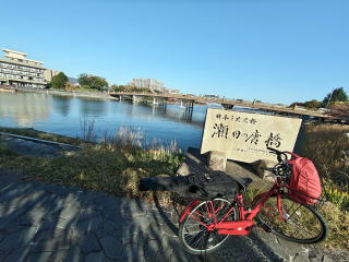 近くの橋を渡って瀬田川沿いのサイクリングも可能な遊歩道を北上。途中、有名な「瀬田の唐橋」を写真に