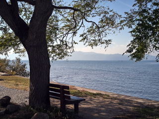 私も1回、お世話になった。ありがたかった~。彦根に入って少し走ると、「あのベンチ」がある湖岸に到着