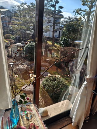 通称の「持ち山」に立ち寄ると、予想通り、日向の梅の花がちらほら咲き始めていた。それを一枝いただいて、家のリビングに活けた。いい香り。